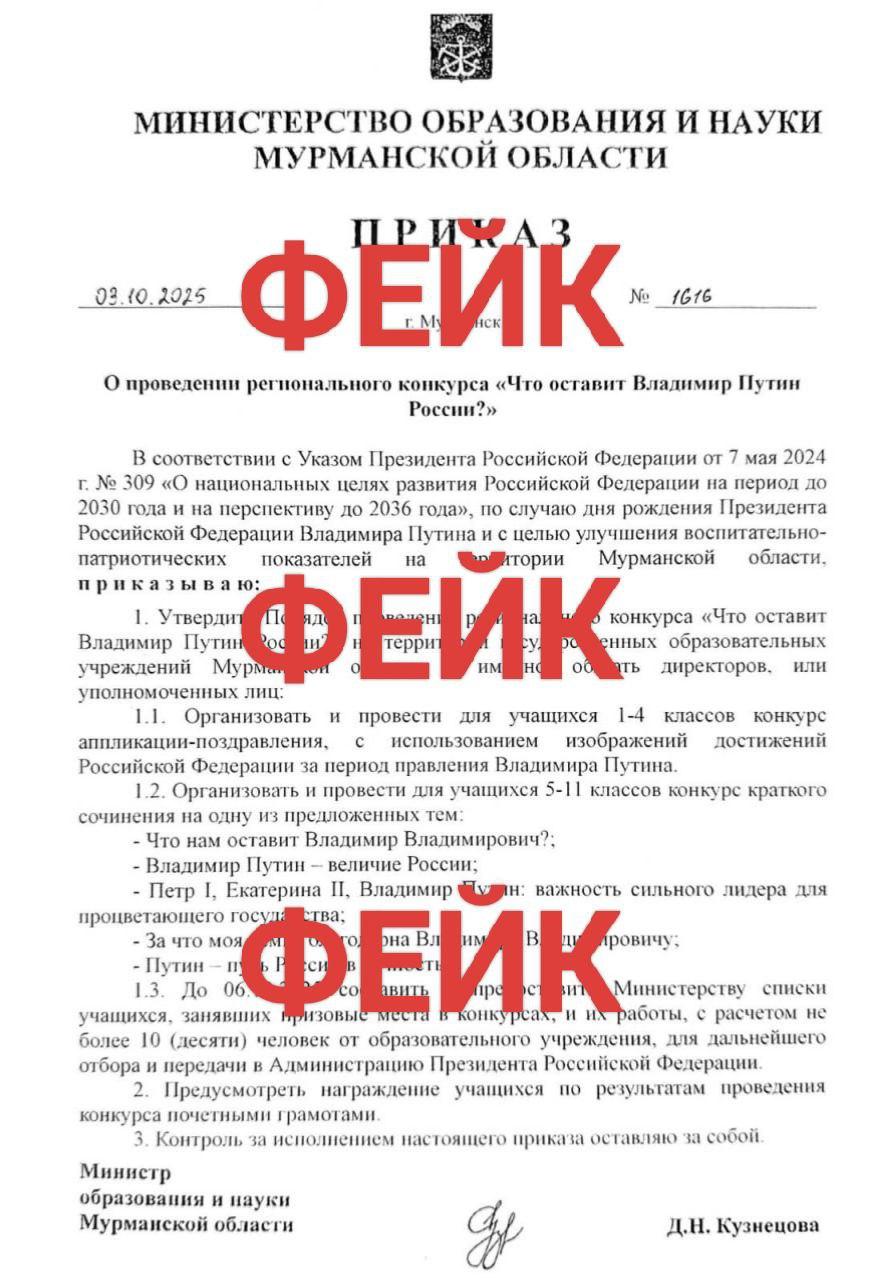 В социальных сетях и родительских чатах распространяется поддельный приказ якобы министерства образования и науки Мурманской области. В нем говорится о конкурсе детских сочинений "Что оставит Владимир Путин России?", организованном "по случаю дня рождения президента".