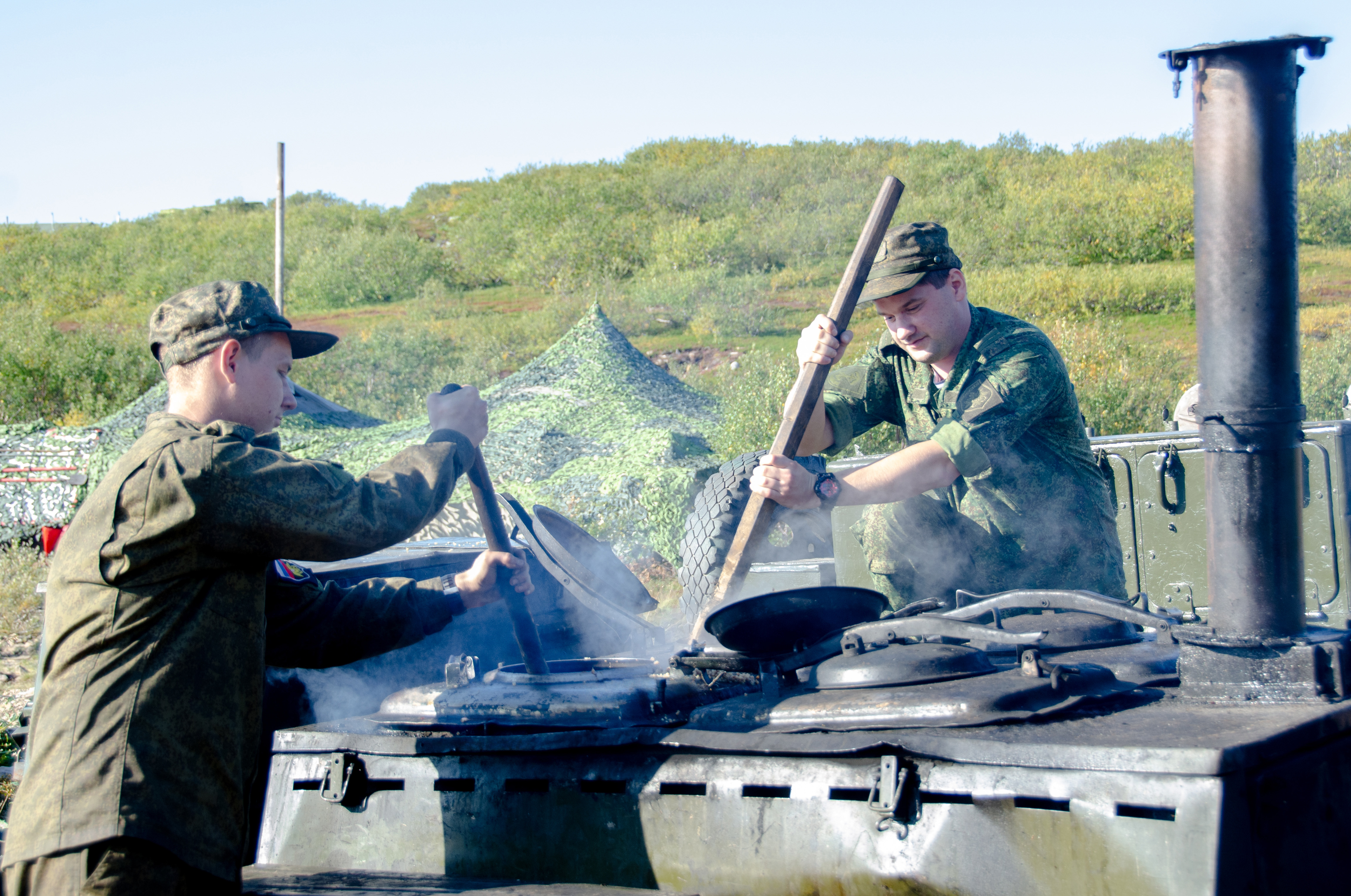 Кашевары-морпехи готовят на походных автоприцепных кухнях КП-125 и КП-130, получившей прозвище "Афганка", оснащенных котлами из нержавейки, водонагревателями и жарочными шкафами. Свой "сценический псевдоним" в честь центральноазиатского государства мобильный комплекс получил неспроста - с началом Афганской войны потребность в полевых кухнях возросла, но в первые ее годы контингент советских войск обслуживали стоящие на вооружении КП-125. Однако вскоре выяснилось, что модель плохо приспособлена к горным дорогам, к тому же готовить в ней пищу можно было лишь на стоянках. Советские конструкторы учли эти недостатки и разработали новую кухню - КП-130, которая поступила на вооружение в 1986 году. Обновленная модель позволяет готовить еду даже на ходу - во время движения автомобиля, что особенно важно во время боевых действий. Кроме того, она получила дополнительное оснащение, которое облегчает работу повара и дает возможность разнообразить рацион бойцов. Вода в котлах таких "камбузов на колесах" закипает в среднем за 60 минут, а работать они могут как на жидком, так и на твердом горючем. Такой походный арсенал способен обеспечить горячим и сытным обедом сразу все подразделение "черных беретов", еще и с запасом.- Пищу на все подразделение готовлю я и два моих помощника. Для приготовления завтрака поварам нужно просыпаться раньше остальных. К пяти утра истопник уже затопил печку, а мы в это время заготавливаем консервы, лук, морковь и другие ингредиенты. Чистим все это, пассируем и готовим горячие блюда, после чего выставляем их на раздачу. Сразу после завтрака мы начинаем готовить обед. И вот так весь день, - рассказывает о своей работе командир отделения поваров гвардии младший сержант Владислав Субботин. - Сегодня у нас на обед суп полевой с пшеном, каша гречневая с тушеной говядиной и чай. Вся еда в походной кухне готовится с дымком, практически на пару, поэтому и получается такой вкусной и доброй, как будто родная мама стряпала. Главной благодарностью от товарищей для нас поваров являются их пустые котелки после обеда.