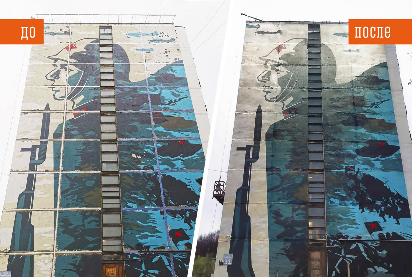 Художники восстановили два мурала на домах №29 и 31 на проспекте Героев-североморцев в Мурманске. На них изображены герои Великой Отечественной войны — моряк и пехотинец.