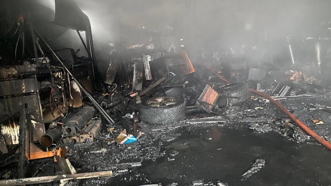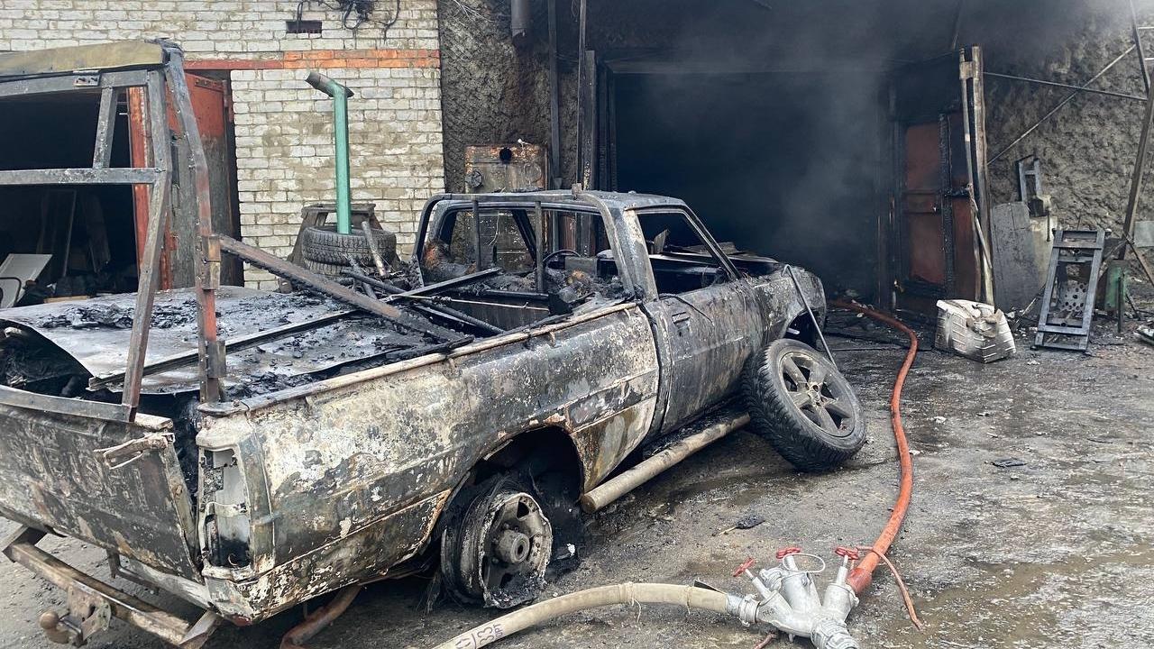 Пожар уничтожил гараж полностью, автомобиль поврежден по всей площади, из помещения эвакуировали баллон с пропаном. В соседнем гараже огонь повредил и частично разобрал кровлю. Из третьего гаража эвакуировали прицеп, снегоход и два баллона с пропаном.