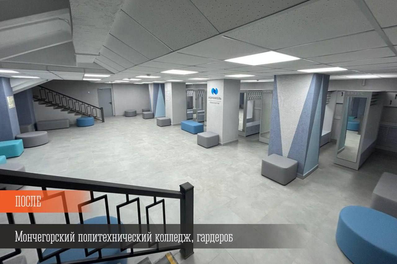 В Мончегорском политехническом колледже отремонтированы спортивный зал и помещения учебного корпуса. Как сообщили в региональном министерстве образования и науки, закуплено новое оборудование и тренажеры, обустроены современные раздевалки и душевые. Также преобразился гардероб учебного корпуса – создана удобная и безопасная инфраструктура. Работы проведены по плану "На Севере – жить!" в рамках соглашения о сотрудничестве правительства Мурманской области и "Норникеля".