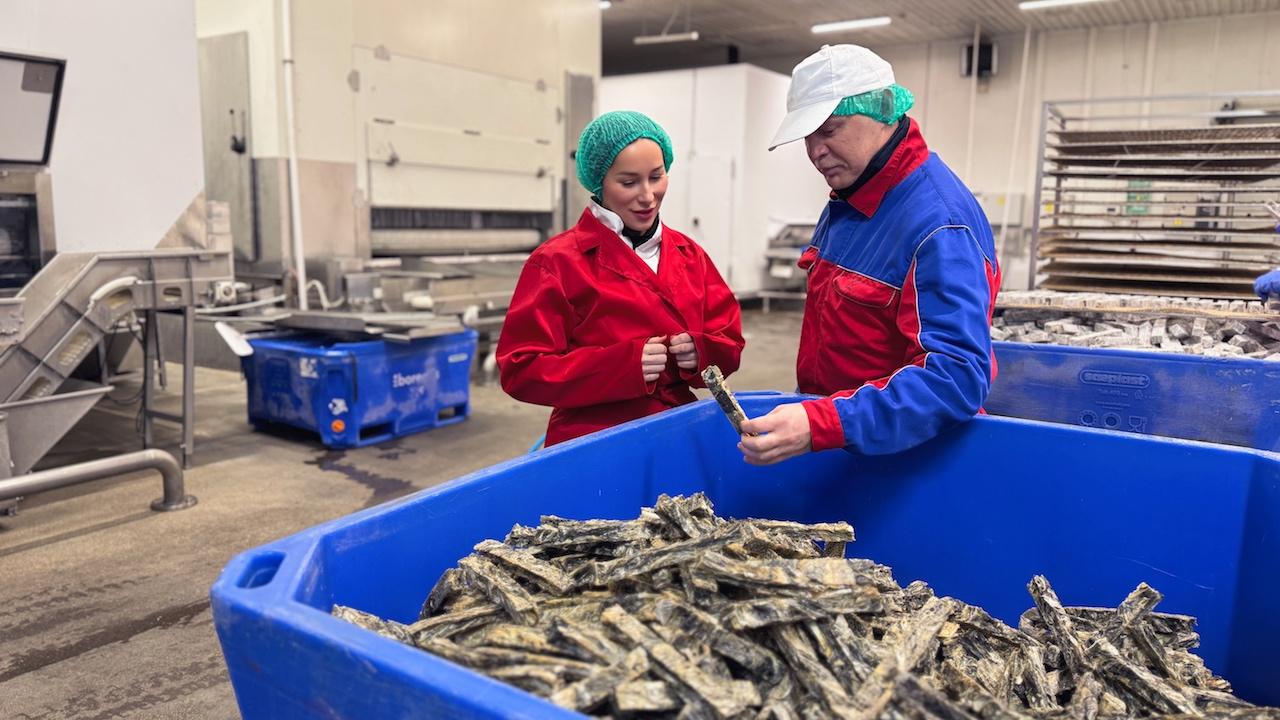 "В Минькино выпускается более 100 наименований рыбной продукции, перерабатывается более 1,5 тысяч тонн сырья в месяц. И, что важно, производство на 100% безотходное: сколько рыбы привезли с промысла, столько и выпустили товара. Даже шкуру трески и пикши здесь не выбрасывают, а используют для производства лакомства для собак. Это еще один пример уважительного отношения к природе", – рассказала Елена Дягилева.