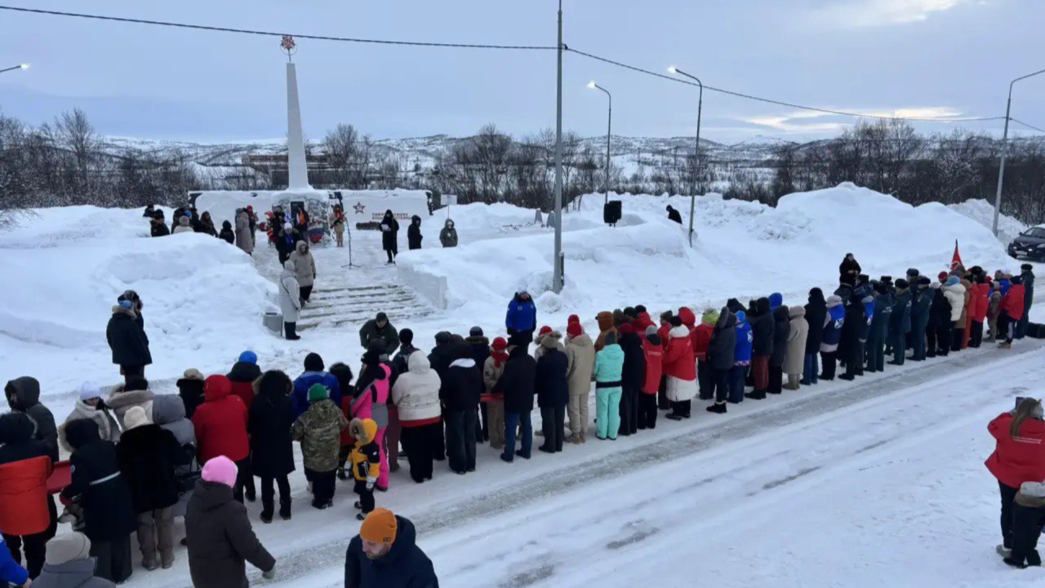 В Заозерске прошел памятный митинг, в финале которого участники пробега вместе с жителями города развернули огромную копию флага Победы.
