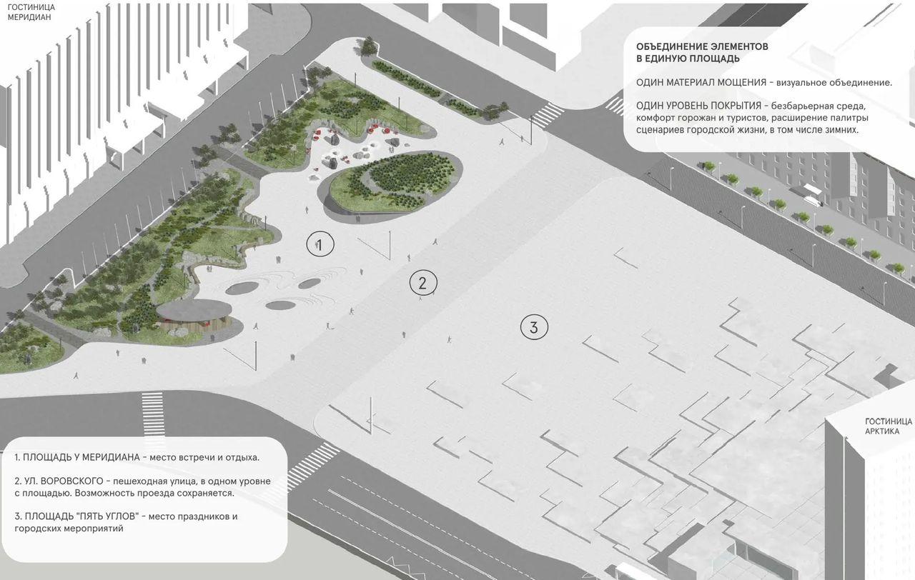 "Интересно, что по задумкам советских градостроителей площадь Пять Углов и территория у конгресс-отеля "Меридиан" являлась единой пространственной единицей, но это идея так и не нашла воплощения в жизни. Единая площадь будет простой, но в то же время монументальной и функциональной. Она станет визитной карточкой Кольского полуострова и всей Арктики, показывая красоту и могущество края, а также отражая дух и силу северных людей", - отметила глава министерства Элина Парамонова.