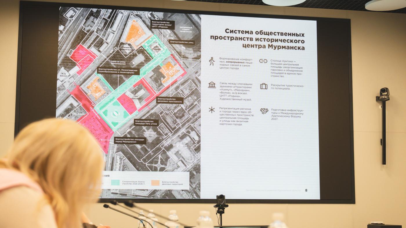 Участники встречи подробно рассмотрели концепт благоустройства площади у конгресс-отеля "Меридиан", которое начнется в 2026 году. Так, планируется объединить улицу Ленинградскую, площадь Пять Углов и пространство у "Меридиана" в связанную систему общественных зон. Однако соседние площади будут кардинально отличаться. Плиты в виде льдин пересекут пешеходную улицу Воровского, объединив два пространства.